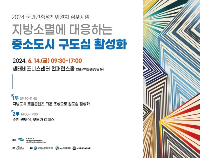 1부에서는 순천시 구도심 활성화를 위해 '지방도시 로컬 콘텐츠 타운 조성으로 구도심 활성화'라는 주제로, 2부에서는 '지방소멸에 대응하는 중소도시 구도심 활성화'라는 주제로 진행된다.