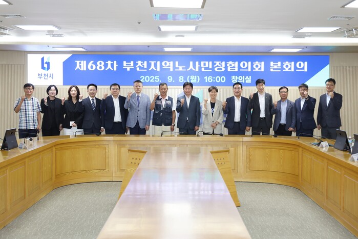 경기 부천시가 2026년도 생활임금을 올해보다 1.68% 인상된 금액인 시급 1만2140원으로 결정했다. 2026년도 생활임금은 부천시 생활임금위원회의 논의와 합의를 거쳐 지난 8일 열린 ‘제68차 부천지역노사민정협의회’에서 최종 결정됐으며, 10일 고시됐다. 사진은 ‘제68차 부천지역노사민정협의회’ 본회의에 참석한 조용익 시장(왼쪽 여덟 번째)이 참석자들과 기념촬영을 하고 있는 모습. (사진=부천시청 제공)