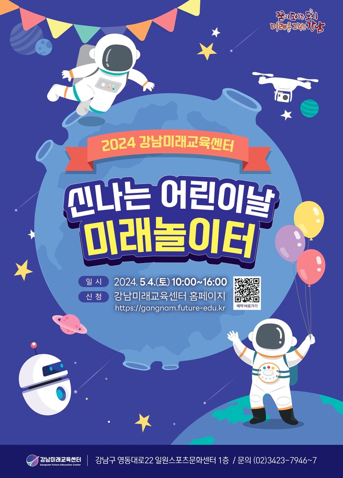 [시민일보 = 이대우 기자] 서울 강남구(구청장 조성명)가 어린이날을 맞아 오는 4일 오전 10시~오후 4시 강남미래교육센터(영동대로 22)에서 가족들과 함께 미래기술을 즐겁게 체험할 수 있는 ‘미래 놀이터’를 운영한다.
