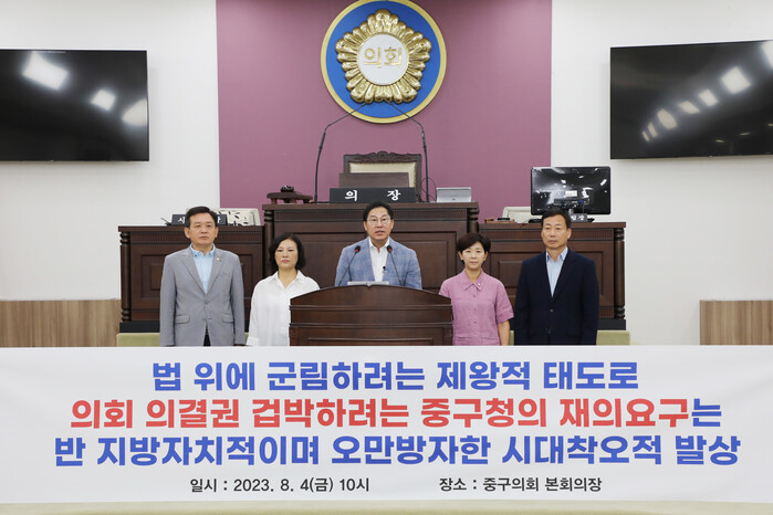 지난 4일 열린 기자회견에는 중구의회 길기영 의장, 윤판오 부의장, 이정미 의원, 송재천 의원, 조미정 의원이 참여했다.