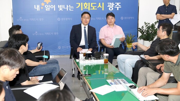 | ▲ 배일권 광주광역시 기획조정실장이 30일 오전 시청 5층 기자실에서 민·군통합공항 관련 광주·전남·무안 3자 회동에 따른 공동입장문을 발표 하고 있다. / 광주광역시 제공 |