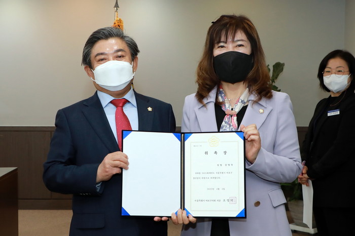 | ▲ 조영덕 의장(왼쪽)이 지난 4일 의장실에서 결산검사 대표위원으로 선임된 강명숙 의원에게 위촉장을 전달하고 있다. (사진제공=마포구의회) |