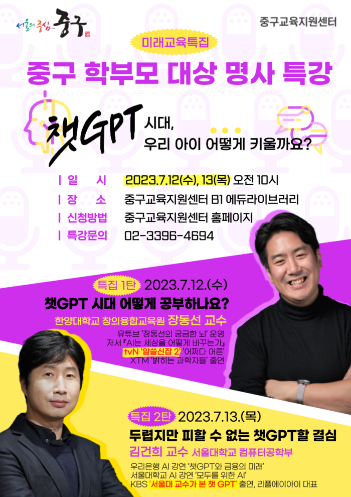 [시민일보 = 여영준 기자] 서울 중구(구청장 김길성)는 생성형 인공지능(AI)이 급부상함에 따라 지역내 학부모들을 대상으로 ‘챗GPT’ 명사 특강을 개최한다고 11일 밝혔다.