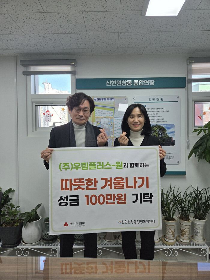 [인천=문찬식 기자] (주)우림플러스-원(대표이사 김학길)은 지난 22일 지역 내 어려운 이웃을 돕기 위해 인천 서구 신현원창동행정복지센터(동장 김재규)에 성금 100만 원을 기탁하였다.