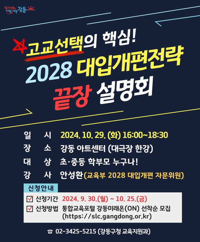 [시민일보 = 이대우 기자] 강동구(구청장 이수희)는 2024 강동 교육주간(10월 28일~11월 1일)을 맞아, 변화하는 입시전형 속에서 초중등 학부모들의 고민을 덜어주기 위해, 10월 29일 강동아트센터에서 ‘2028 대입개편전략 끝장 설명회’를 개최한다고 밝혔다.