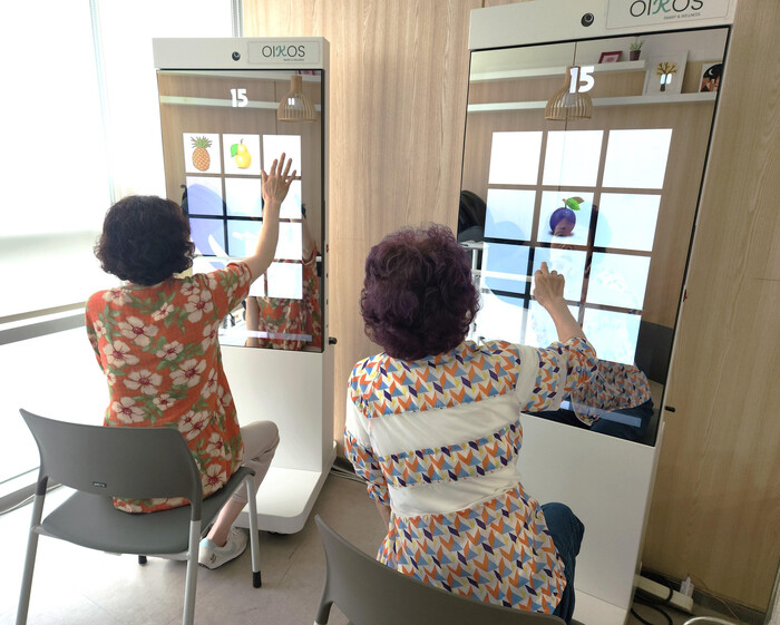 | ▲ 스마트 미러 기기를 활용한 인지훈련. (사진=영등포구청 제공) |