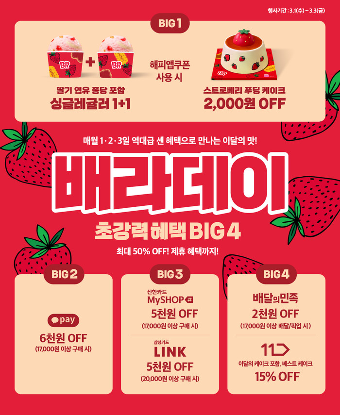배스킨라빈스는 ‘딸기 연유 퐁당’ 출시를 기념해 3월 1일부터 3일까지 이달의 맛을 가장 먼저, 가장 큰 혜택으로 즐길 수 있는 ‘배라데이’를 실시한다. 우선, 해피포인트 애플리케이션(해피앱) 이벤트 페이지에서 3월 이달의 맛 ‘싱글 레귤러 1+1’ 또는 ‘이달의 케이크 2천원 혜택’ 쿠폰을 지급한다.