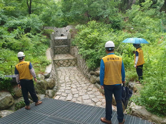 | ▲ 점검을 진행하는 중랑구 산사태 현장 예방단의 모습. (사진=중랑구청 제공) |