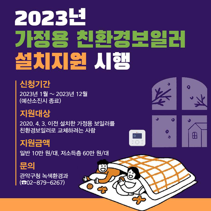 구 관계자는 “친환경보일러 보급 확대로 취약계층의 난방비 절감에 보탬이 되고 다양한 미세먼지 저감 대책 추진으로 ’청정도시 관악‘ 만들기에도 노력하겠다”라고 말했다.