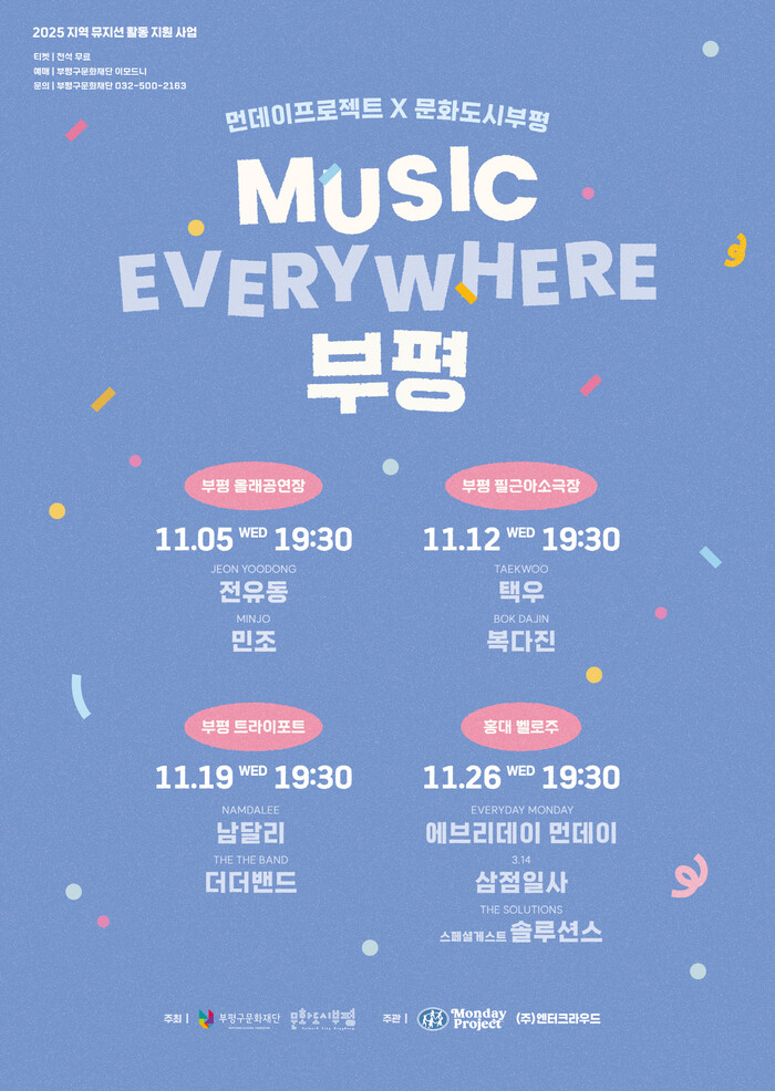 [인천=문찬식 기자] 인천 부평구 문화재단 문화도시센터는 오는 11월 매주 수요일 오후 7시30분 지역 뮤지션들의 공연 ‘MUSIC EVERYWHERE 부평’을 총 4회에 걸쳐 진행한다고 14일 밝혔다.
