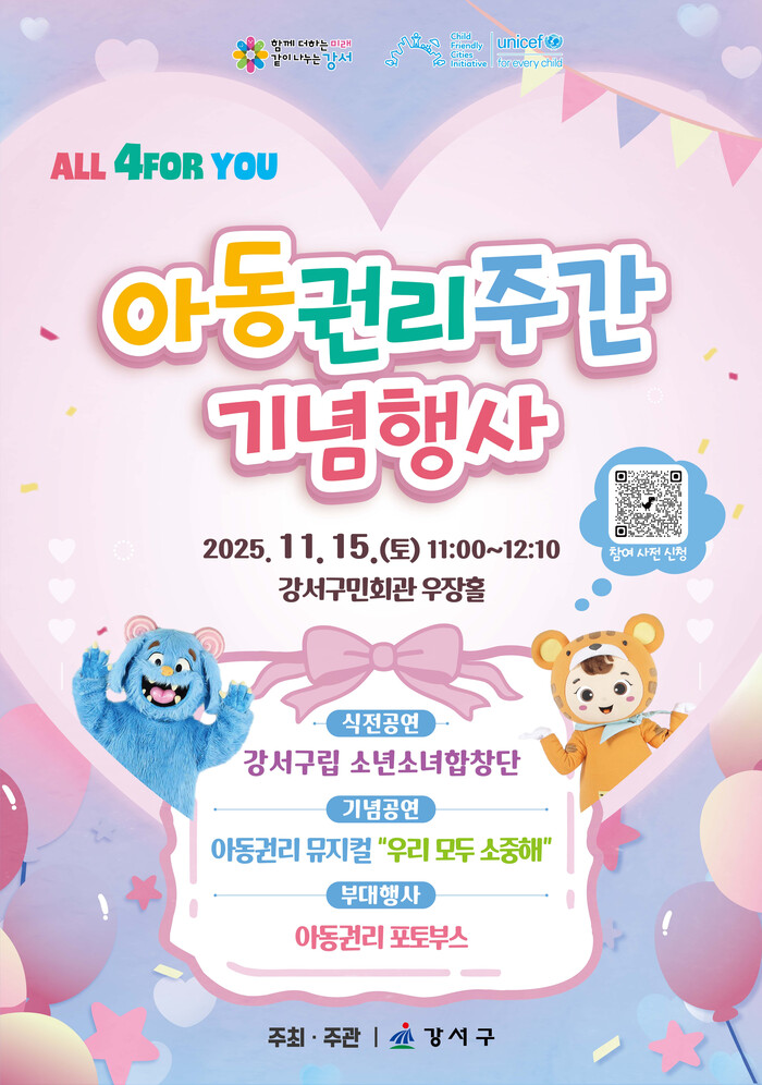[시민일보 = 박소진 기자] 서울 강서구(구청장 진교훈)가 오는 15일부터 21일까지 일주일간 ‘2025년 아동권리주간’을 운영한다.