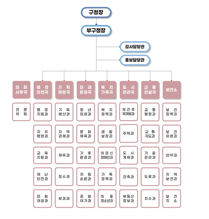 구의 이 같은 결정은 민선 8기 핵싱 공약사업의 효율적인 진행을 위한 것이며, 조직개편 주요 사항으로는 ▲청년미래과, 아동청소년과, 재건축재개발과‘ 신설 ▲약자와의동행TF팀, 1인가구지원팀, 일자리지원팀, 하천여가팀 등의 신설이다.