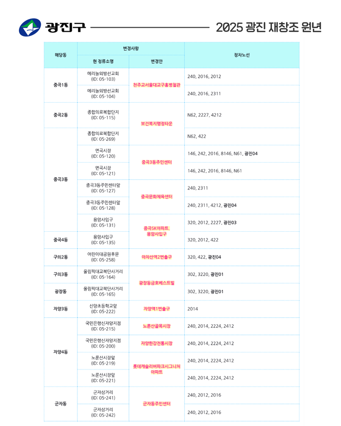 [시민일보 = 여영준 기자] 광진구(구청장 김경호)가 지역내 시내버스정류소 20곳의 이름을 바꿨다.