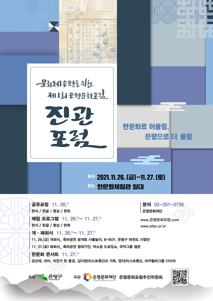 이번 포럼의 주제는 ‘한(韓)문화’로 은평의 한문화특구인 진관동 한문화 체험관을 중심으로 열려 이곳의 지명을 가져와 ‘진관포럼’이라는 이름으로 진행한다. 은평의 한문화 가치를 알리고, 재조명하는 체험형 문화포럼으로 ‘한문화로 어울림, 은평으로 더 울림’이라는 슬로건 아래 전문 공유포럼, 체험 프로그램, 한문화 콘서트 등 다채로운 프로그램이 마련돼 있다.