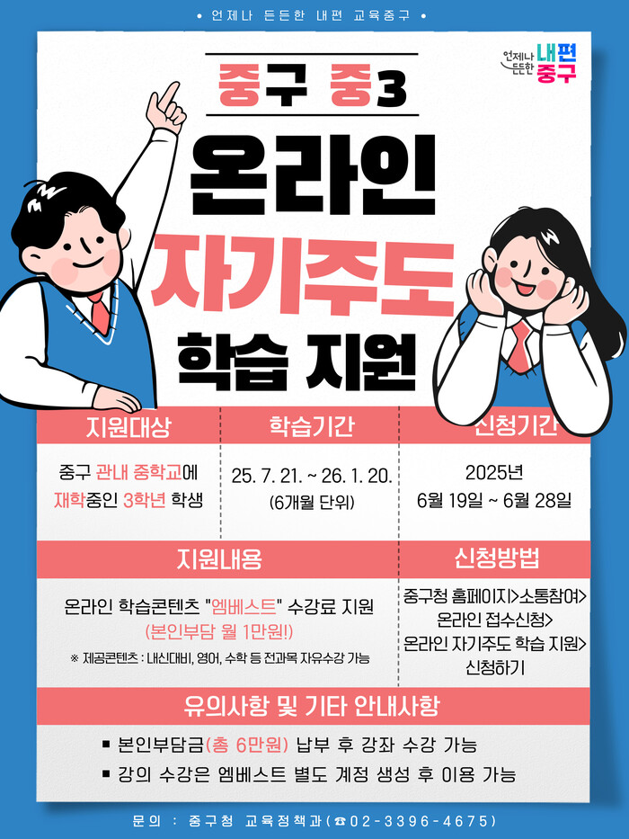 [시민일보 = 여영준 기자] 서울 중구는 오는 7월부터 중학교 3학년 학생들을 대상으로 유명 인터넷 강의 플랫폼인 엠베스트 수강권을 지원하는 온라인 학습콘텐츠 지원사업을 시작한다고 23일 밝혔다.