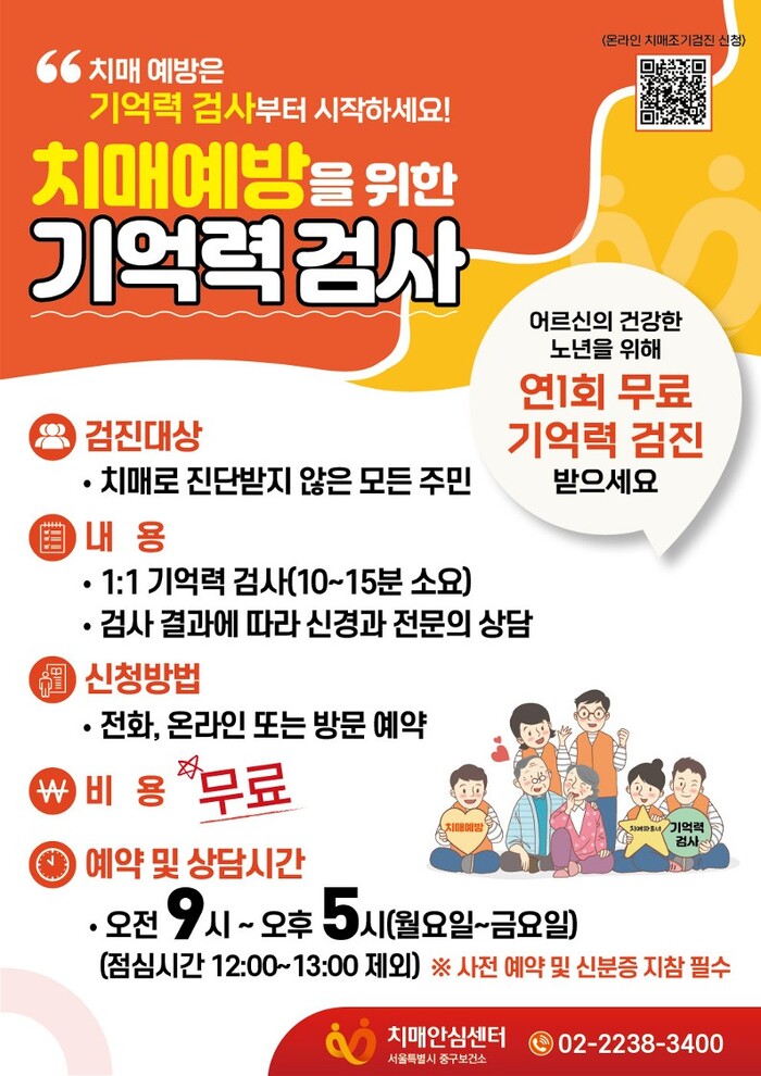 [시민일보 = 여영준 기자] 서울 중구가 3~5월 동주민센터에서 치매 선별 검진을 진행한다.