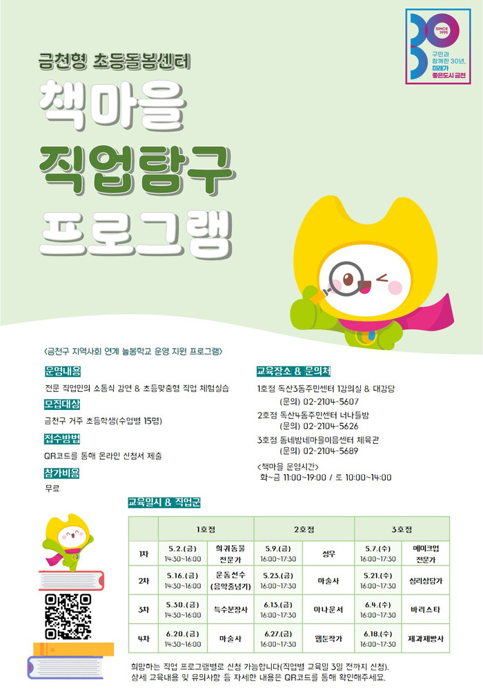 ‘책마을 직업탐구 프로그램’은 5월 2일부터 6월 27일까지 책마을 1~3호점에서 4회차씩 진행된다. 책마을은 1호점 청개구리작은도서관(독산3동 주민센터), 2호점 꿈씨어린이 작은도서관(독산4동 주민센터), 3호점 꿈꾸는 작은도서관(시흥3동 동네방네 마을이음센)에서 운영되고 있다.