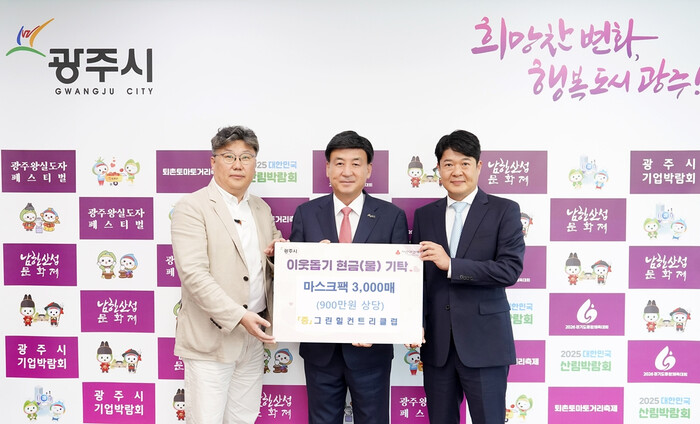경기 광주시가 19일 신안개발(주) 그린힐컨트리클럽로부터 지역내 어려운 이웃들을 위한 신안코스메틱 마스크팩 3000장(900만원 상당)을 기탁받았다. 사진은 방세환 시장(가운데)이 기탁식에서 관계자들과 기념 촬영을 하는 모습. (사진=광주시청 제공)