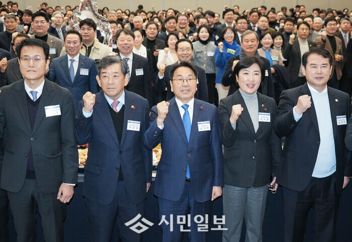 [광주=정찬남 기자] 강기정 광주광역시장(사진 가운데)이 6일 오전 서구 김대중컨벤션센터에서 열린 ‘2026년 광주상공회의소 신년인사회’에 참석해 한상원 광주상의 회장, 국회의원, 경제인 등과 힘차게 구호를 외치고 있다./광주광역시 제공