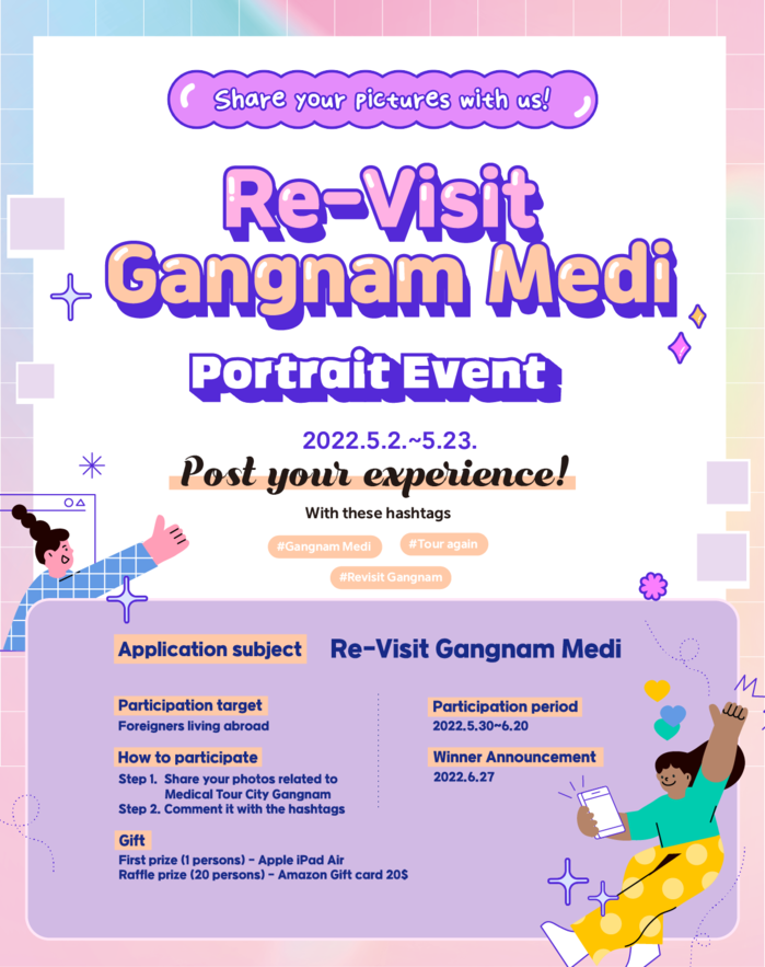 이번 이벤트는 코로나19로 주춤했던 해외관광객의 강남 방문 욕구를 자극하고, ‘의료관광 1번지 강남’의 브랜드 이미지를 홍보하기 위해 기획된 것으로, 강남 의료관광 경험이나 계획이 있는 해외거주 외국인을 대상으로 한다.