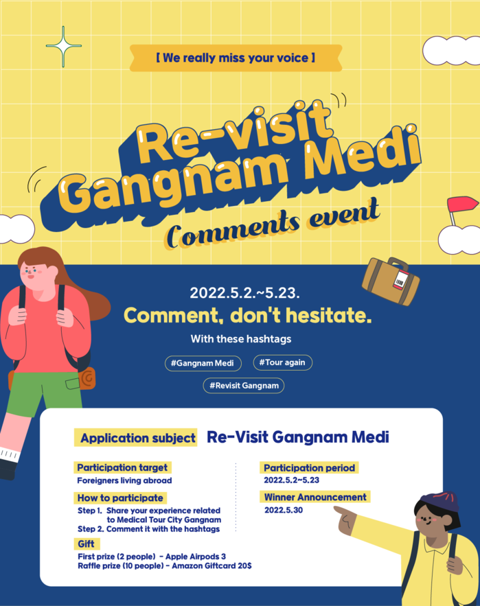이벤트는 영·중·일·러 공식 SNS를 팔로우한 뒤, 게시물에 필수 해시태그(#revisitgangnam, #gangnammedi, #touragain)와 함께 댓글을 달아 응모할 수 있다. 친구를 태그하면 당첨 확률이 높아지며, 우수 댓글 2명에 에어팟, 10명을 추첨해 아마존 기프트카드 20달러를 지급한다.