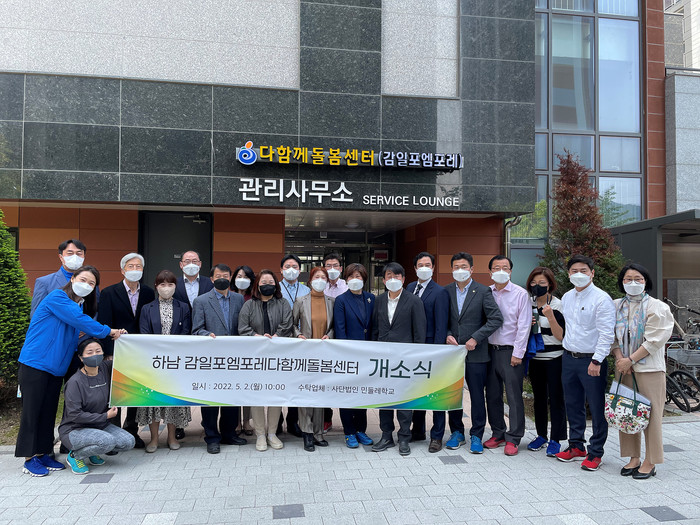 경기 하남시는 2일 감일동 감일포엠포레 아파트 주민공동시설에서 ‘감일포엠포레 다함께돌봄센터’ 개소식을 개최했다. 이번 감일포엠포레 다함께돌봄센터는 한국토지주택공사와 공간협약을 체결했고, (사)민들레학교에서 5년간 돌봄센터를 위탁 운영하게 된다. 사진은 개소식에서 김상호 시장(뒷줄 왼쪽)이 관계자들과 기념촬영을 하는 모습.(사진제공=하남시청)