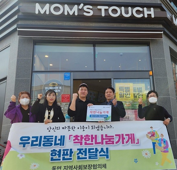 [양산=최성일 기자] 양산시 동면지역사회보장협의체(공동위원장 김종덕·송영철)는 지난 10일 맘스터치 양산사송점(대표 최연단)과 착한나눔가게 48호점으로 선정하고 협약식을 갖고 현판을 전달했다.