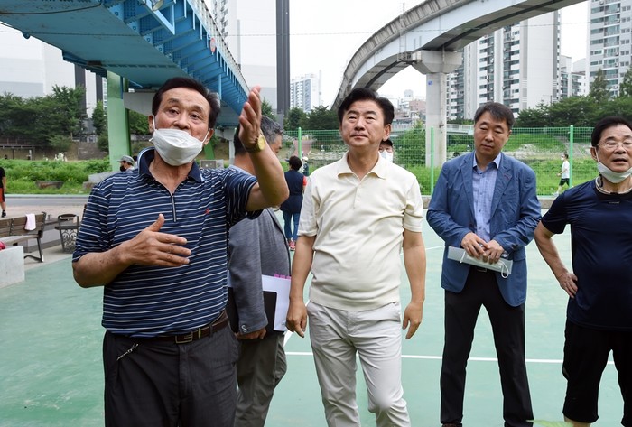 김동근 경기 의정부시장은 27일 중랑천 산책로와 체육시설 등을 이용하는 시민들의 의견을 직접 듣기 위해 인도교~부용천 합류부 약 2.5km의 달하는 거리를 걸으며 점검했다. 사진은 이날 김 시장(왼쪽 두 번째)과 관계자들이 중랑천을 걸으며 현장점검을 하고 있는 모습. (사진제공=의정부시청)