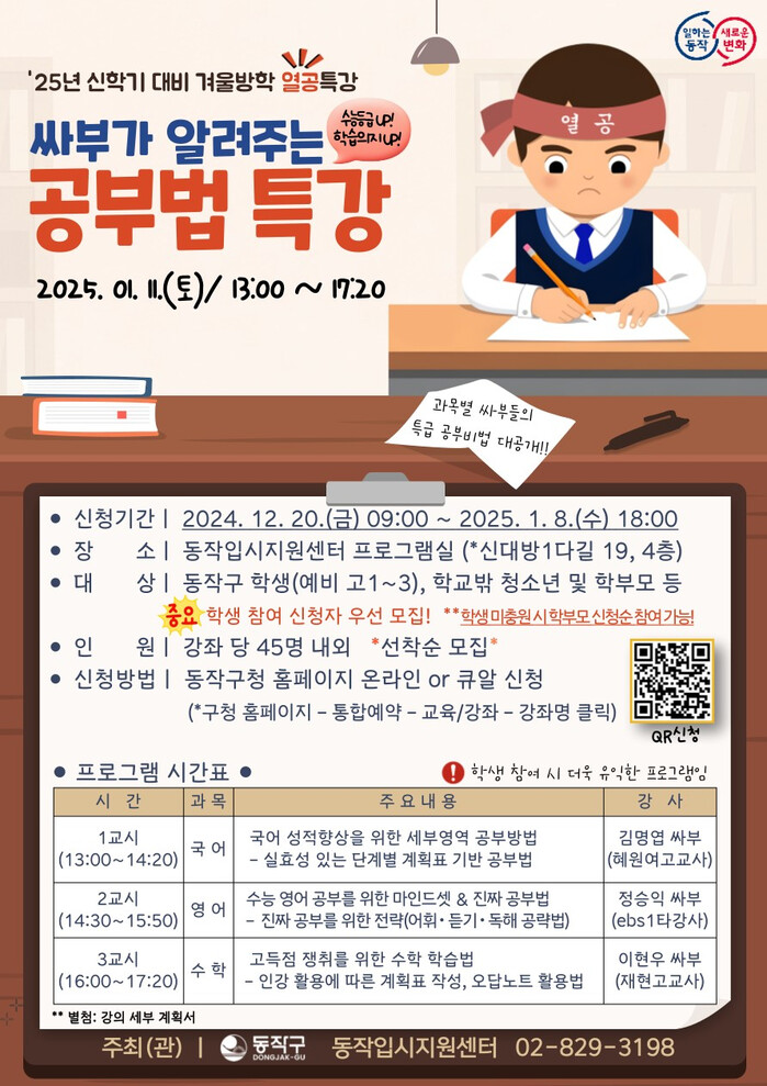 | ▲ 2025 신학기 대비 ‘싸부가 알려주는 공부법 특강’ 홍보 포스터. (사진=동작구청 제공) |