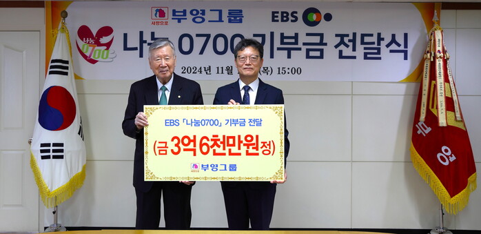 [시민일보 = 박소진 기자] 부영그룹이 올해도 우리 사회의 도움이 필요한 이웃을 후원하는 EBS 사회공헌 프로그램인 ‘나눔 0700’ 기부에 참여하며 3년 연속 아름다운 동행을 이어간다.
