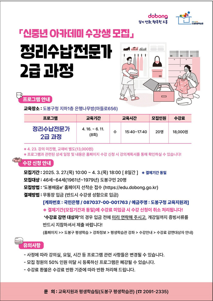 [시민일보 = 문민호 기자] 서울 도봉구(구청장 오언석)가 신중년을 대상으로 ‘정리수납 전문가 2급 과정’을 운영한다.