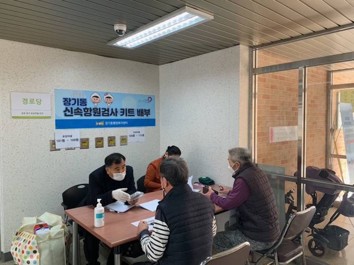 경기 김포시 장기동 행정복지센터는 최근 중증장애인 등 감염취약계층을 대상으로 배부하는 신속항원검사 키트를 대상자들의 편의성과 배부의 효율성을 높이고자 거주하는 임대아파트 관리사무소에 찾아가서 대상자에게 배부했다. 사진은 대상 노인들에게 신속항원검사 키트를 제공하고 있는 모습. (사진제공=김포시청)