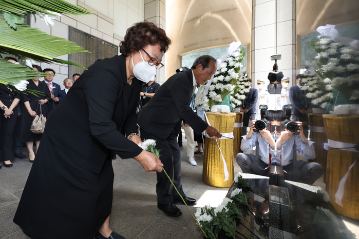 7일 서울 용산구 전쟁기념관에서 열린 제2연평해전 20주년 기념행사에서 전사자 유족들이 헌화하고 있다.