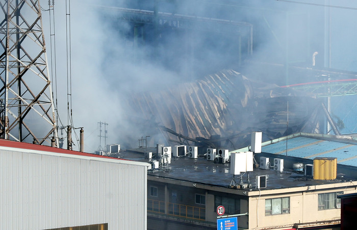 6일 오전 인천시 동구 현대제철 공장 내 한 시설이 화재로 찌그러져 있다. 불은 공장 내 에너지 저장장치(ESS)에서 난 것으로 파악됐다. 이 화재로 이날 오전 9시까지 인천피해는 없지만, 화염과 함께 검은 연기가 치솟아 119 신고가 잇따랐다.