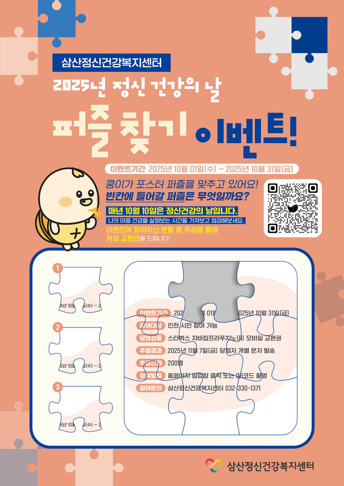 이벤트는 퍼즐찾기와 우울증선별검사(PHQ-9)로 구성됐으며, 센터는 두 가지를 모두 완료한 시민을 대상으로 추첨을 통해 200명에게 커피 교환권을 증정한다.