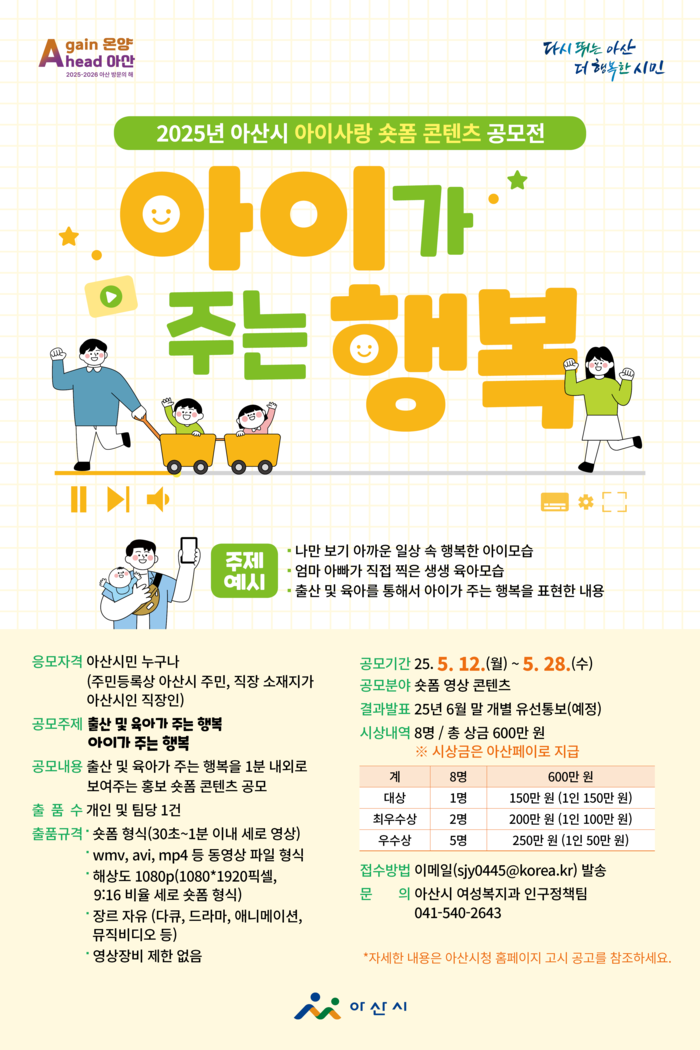 [아산=박명수 기자] 충남 아산시가 저출산 극복과 출산 친화적 사회 분위기 조성을 위해 ‘2025년 아산시 아이사랑 숏폼 콘텐츠 공모전’을 개최한다고 12일 밝혔다.