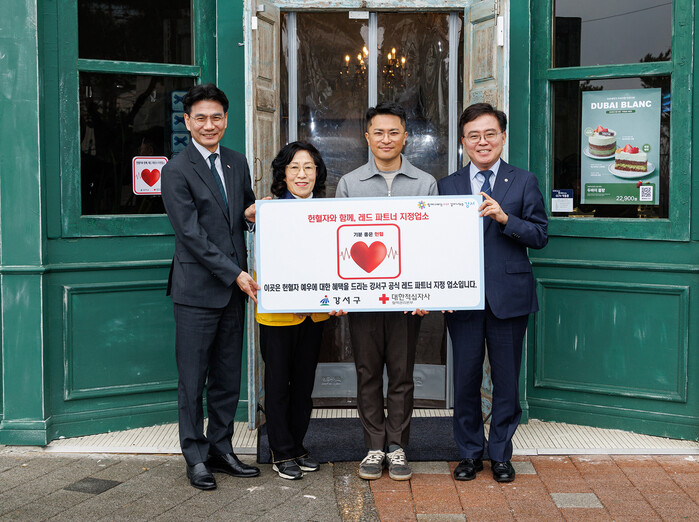 진교훈 서울 강서구청장이 지난 18일 헌혈자에게 할인 등 혜택을 제공하는 ‘레드 파트너’ 지정업소 인증식에 참석했다. 진 구청장은 이날 마곡동 소재 ‘타르데마 베이커리 서울식물원점’을 찾아 김태휘 타르데마 대표에게 ‘레드 파트너’ 지정업소 인증서를 전달했다. 사진은 진 구청장(맨 오른쪽)이 기념 촬영을 하는 모습. (사진=강서구청 제공)