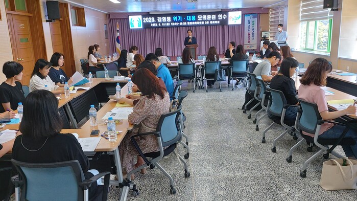 강사로 초빙된 경상남도감염병관리지원단의 양혜련 부단장은 도내 주요 발생 감염병 및 학교 감염병 예방관리에 대한 강의가 진행됐으며, 학교에서 주로 발생하는 감염병에 대한 이해와 역학조사 방법 및 관리 방안에 대한 중요성을 강조했다. 이어 참석자 11명을 3개조로 구성하여 각 조별로 학교 구성원의 역할을 부여하고, 학교내 감염병 발생을 가상한 시나리오를 활용하여 감염병 위기단계별로 시나리오에 따라 서로의 역할을 논의하여 대응방법을 찾아가는 모의훈련을 실시했다.