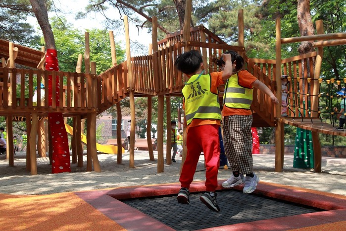 광진구가 최근 ‘아차산 숲속 놀이터’를 개장했다. 구는 아차산 관리사무소 뒤편의 노후한 어린이 놀이터를 숲속 놀이터로 새 단장해, 도심에서 뛰어놀기 힘든 어린이들에게 흙을 만지고 나무 사이를 뛰어다니며 자연을 마음껏 누릴 수 있는 공간을 제공한다. 사진은 어린이들이 숲속 놀이터에서 트램펄린을 하고 있는 모습. (사진제공=광진구청)