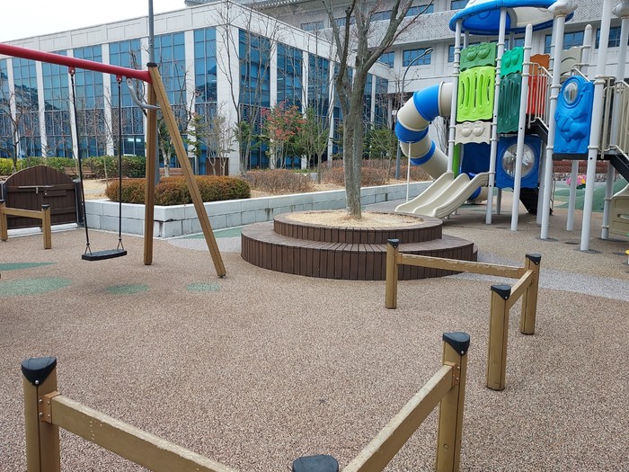 야외 놀이터에는 어린이들이 친구들과 함께 뛰어놀 수 있도록 다양한 놀이기구가 설치돼 있고, 이를 둘러싸는 성인 무릎 높이의 대리석 담벼락이 만들어져 있다.