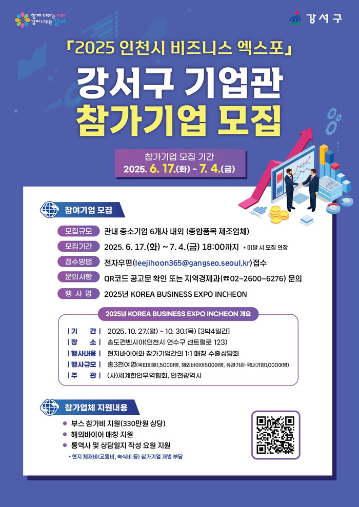 [시민일보 = 박소진 기자] 강서구(구청장 진교훈)가 오는 10월 인천 송도에서 열리는 ‘2025 한국 비즈니스 엑스포 인천’에 참가할 중소기업을 모집한다.