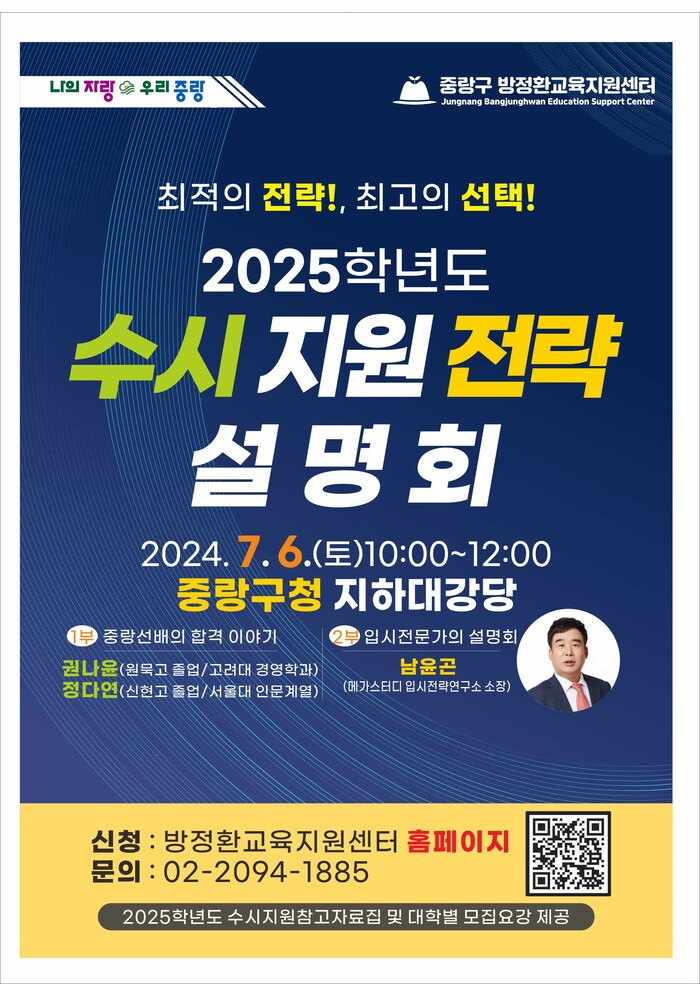 [시민일보 = 여영준 기자] 서울 중랑구(구청장 류경기)가 7월 6일 중랑구청 지하대강당에서 대학교 진학을 앞둔 수험생과 학부모를 대상으로 ‘2025학년도 수시지원전략 설명회’를 개최한다.