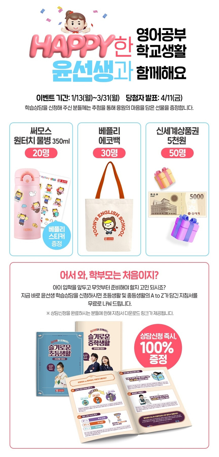 영어교육 전문기업 윤선생은 오는 3월31일까지 새 학년 힘찬 출발을 응원하는 이벤트를 연다. 공식 홈페이지에서 윤선생 학습 상담을 신청하면 학교 생활에 유용한 써모스 원터치 물병, 베플리 에코백 등을 추첨 증정한다.