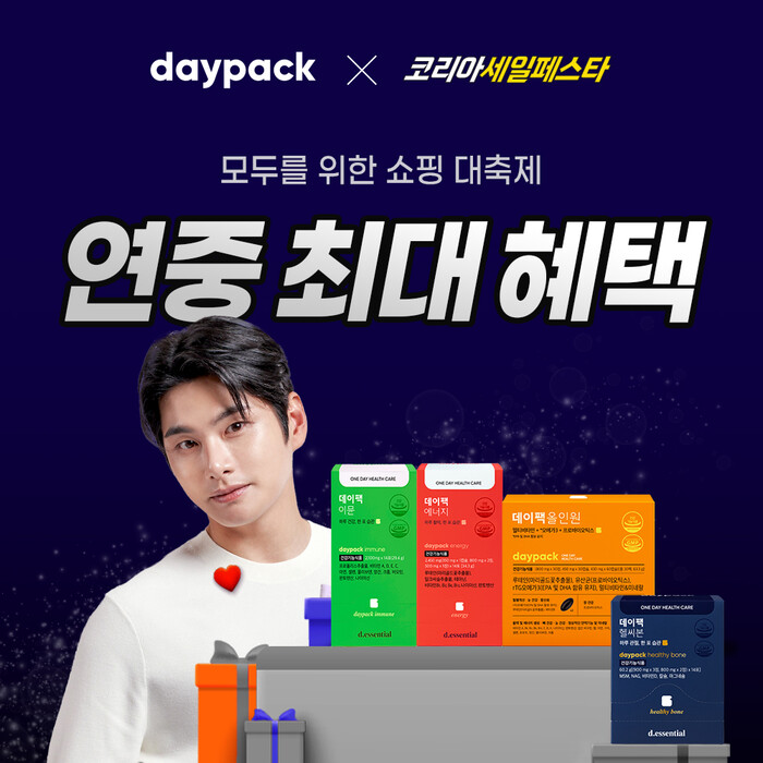 데이팩은 오는 30일까지 ▲기본건강을 위한 ‘데이팩 올인원’ ▲피로회복, 활력맞춤 ‘데이팩 에너지’ ▲면역력 관리를 위한 ‘데이팩 이뮨’ ▲뼈와 관절 건강 맞춤 ‘데이팩 헬씨본’까지 전 상품 연중 최대 할인 혜택과 더불어 다양한 사은품을 제공할 예정이다.