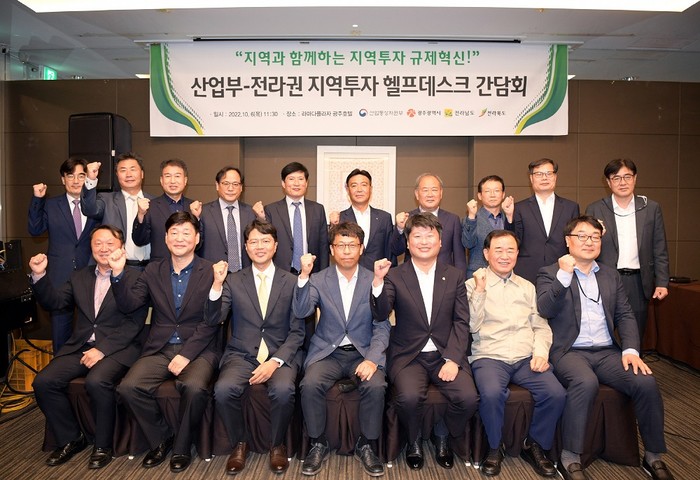 [광주=정찬남 기자] 김광진 광주광역시 문화경제부시장(앞줄 왼 쪽부터 3번)이 6일 오전 라마다호텔에서 열린 산업부-전라권 지역투자 헬프데스크 간담회에 참석해 지역 투자유치 현안과 애로사항을 청취한 후 참석자들과 기념촬영을 하고 있다. /광주광역시 제공