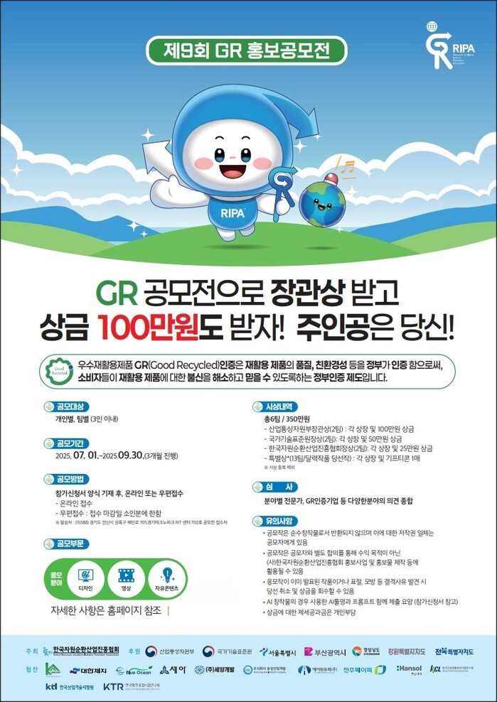 한국자원순환산업진흥협회(회장 민경보)는 국가 인증제도인 우수재활용제품(GR) 인증 제도의 대중적 확산과 인지도 향상을 위해 ‘제9회 GR 홍보공모전’을 개최하고, 7월 1일부터 9월 30일까지 전 국민을 대상으로 공모작 접수를 받고 있다고 밝혔다.