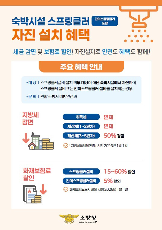 성남소방서 관계자는 “숙박시설은 화재에 취약한 만큼 스프링클러설비 설치가 무엇보다 중요하다”라며 “안전 확보와 함께 세금 감면과 보험료 할인 혜택이 주어지는 이번 제도에 적극적인 참여를 바란다”라고 말했다.