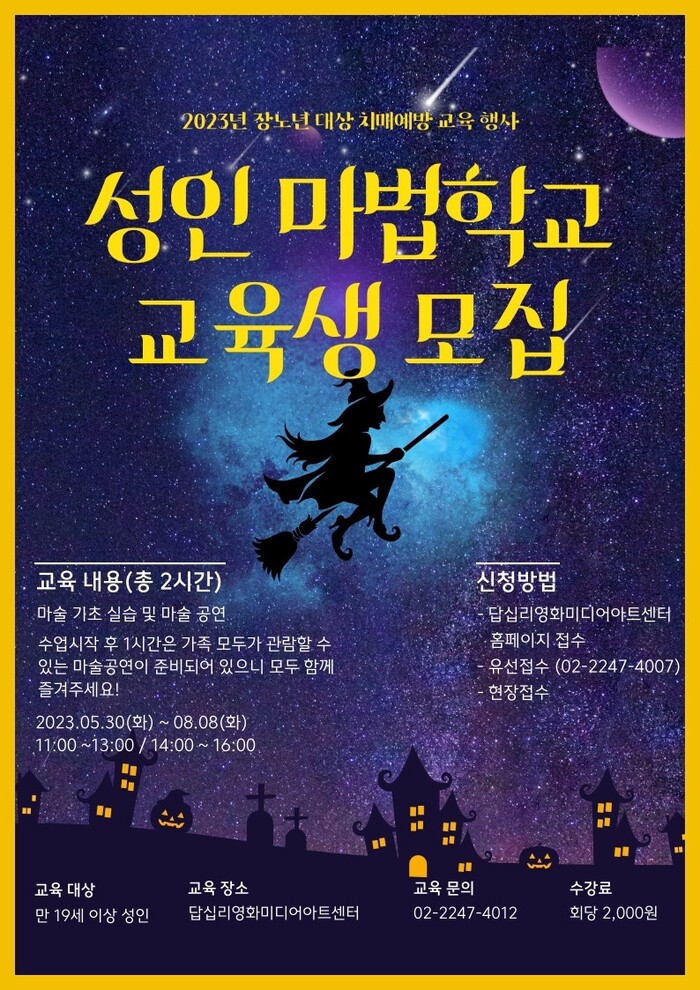 ‘성인 마법학교’는 답십리영화미디어아트센터 3층에서 8월 8일까지 매주 화요일 오전 11시와 오후 2시에 각각 2시간 씩 진행된다.