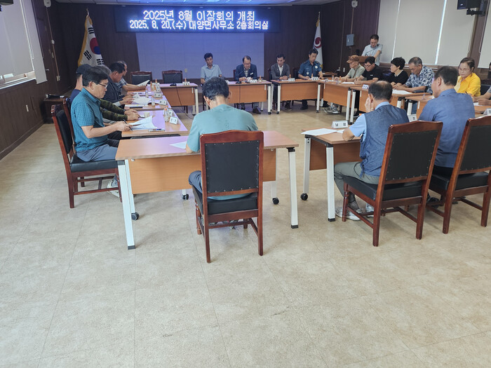 박수영 대양면장은 "지난 7월말 집중호우리 인해 많은 비가 와 피해가 발생하였지만 17개 마을 이장님들과 기간사회단체장님들의 적극적인 협조로 빠르게 응급복구가 이루어진 점에 대하여 깊은 감사를 드린다"며 "이장님들의 관심과 협조가 대양면을 지키는 가장 큰 힘이 되므로, 면민들이 힘을 모아 안전한 대양면을 만드는 데 최선을 다해 주시길 바란다"고 강조했다.