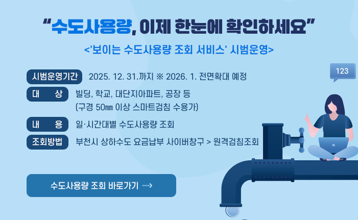 [부천=문찬식 기자] 경기 부천시는 스마트검침시스템을 기반으로 한 ‘보이는 수도사용량 조회 서비스’를 이달부터 오는 12월까지 시범 운영한다고 16일 밝혔다.